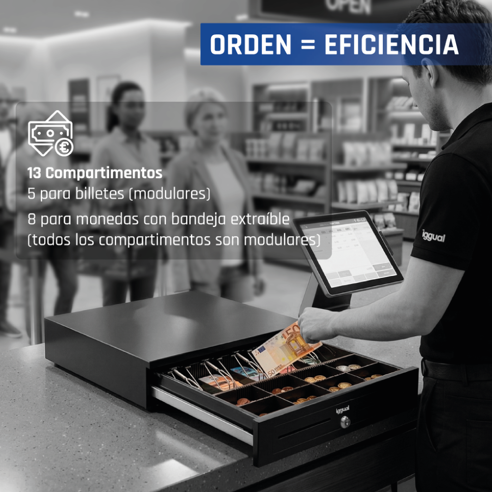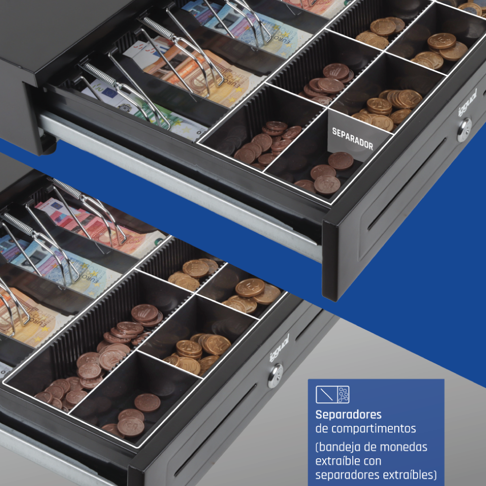 - Compartimentos: 5 billetes y 8 monedas (ajustables y extraíbles)