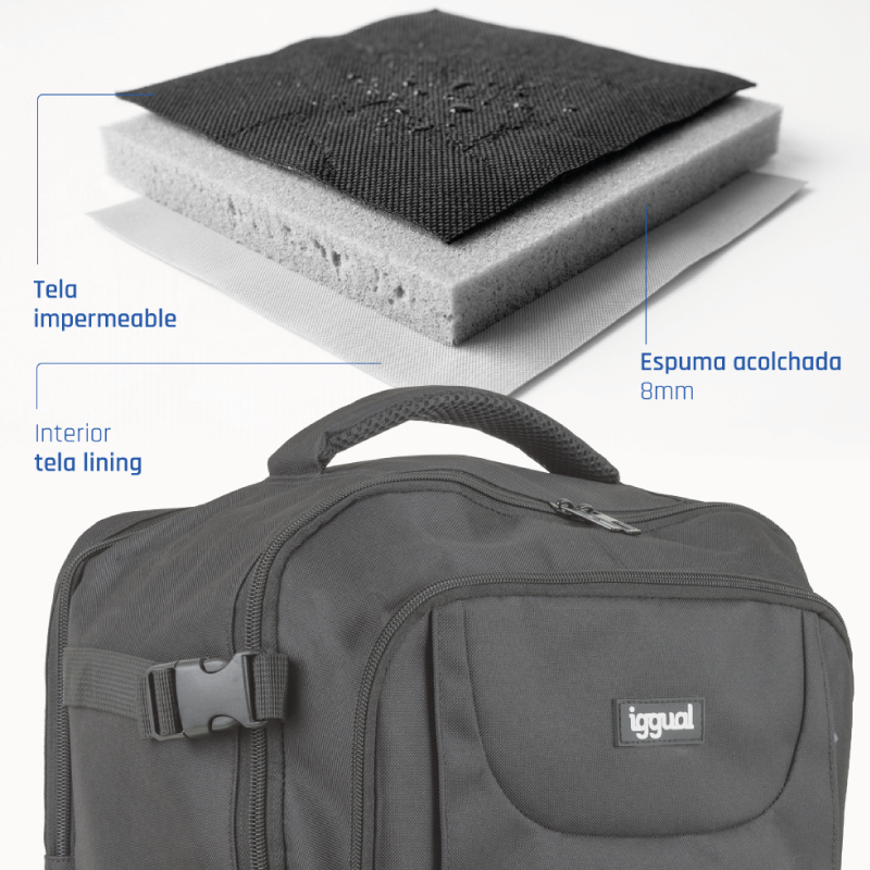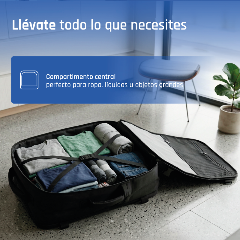 - Compartimento frontal de gran capacidad con correas para ropa